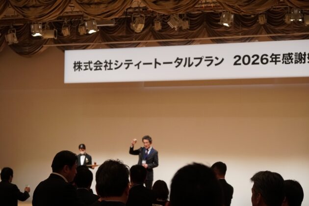 「弊社創業時には会合で名刺に見向きもされない悔しい思いから一転、今はこれだけ多くの方に支えていただくに至った感謝」という言葉に加え、過去にもコピー機1台のリース契約も組めない苦難や1棟目の分譲事業を始めるに至る長大なプロセスを伺ったエピソードから、社員一同も心が熱くなる瞬間です。